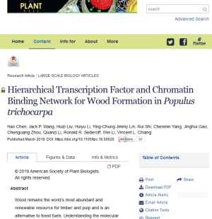 2019年3月,Plant Cell杂志第31期发表了题为“Hierarchical Transcription Factor and Chromatin Binding Network for Wood Formation in Populus trichocarpa”的研究论文。该研究为提高森林生产力提供了一条崭新且精确的遗传改良途径,该论文被选为该月期刊封面文章。