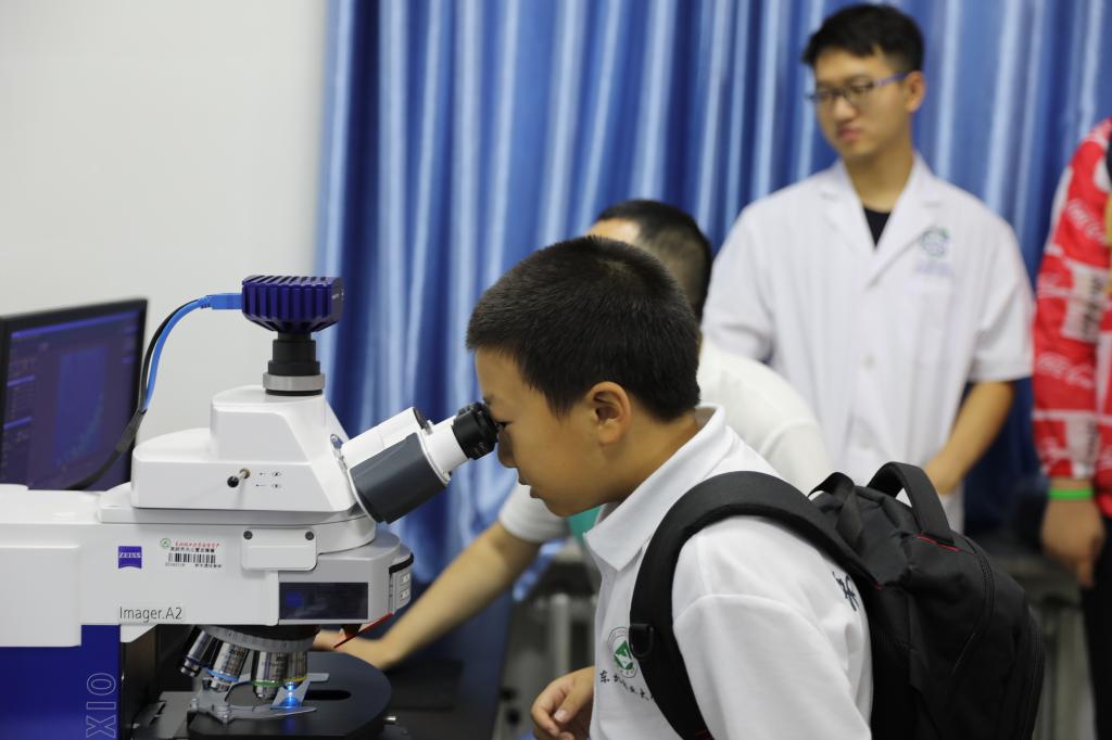 在实验室仪器开放共享平台,曲春浦老师为同学们演示了高大上的荧光显微镜,讲解了成像的原理,同学们通过显微镜观察到了玉米颈的横切片成像;在电泳室,同学们看到了植物的基因图像;在研究生哥哥姐姐们的指导下,同学们还亲自动手提取了植物的组织,试着用移液枪移取微量液体。
