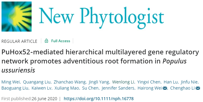 近日,林木遗传育种国家重点实验室(东北林业大学)李成浩研究组和美国密歇根理工大学卫海荣教授合作在国际植物学知名期刊New Phytologist(生物学一区,IF=7.299)在线发表了题为“PuHox52-mediated hierarchical multilayered gene regulatory network promotes adventitious root formation in Populus ussuriensis”的研究论文。该研究阐明了大青杨PuHox52转录因子通过上调9个根发育调控基因和下调1个组蛋白去乙酰化酶基因PuHDA9的表达水平,从而调控不定根发生的分子机制。
