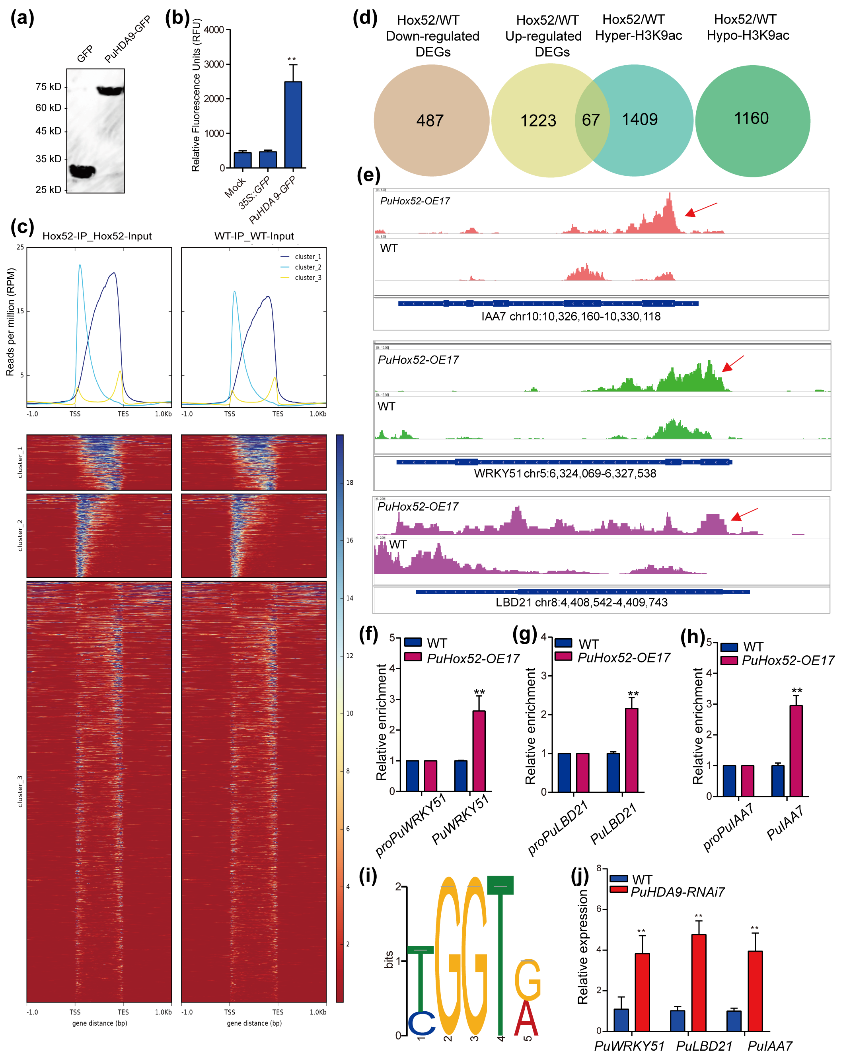图3. H3K9乙酰化及其对PuHox52靶基因的调节机制