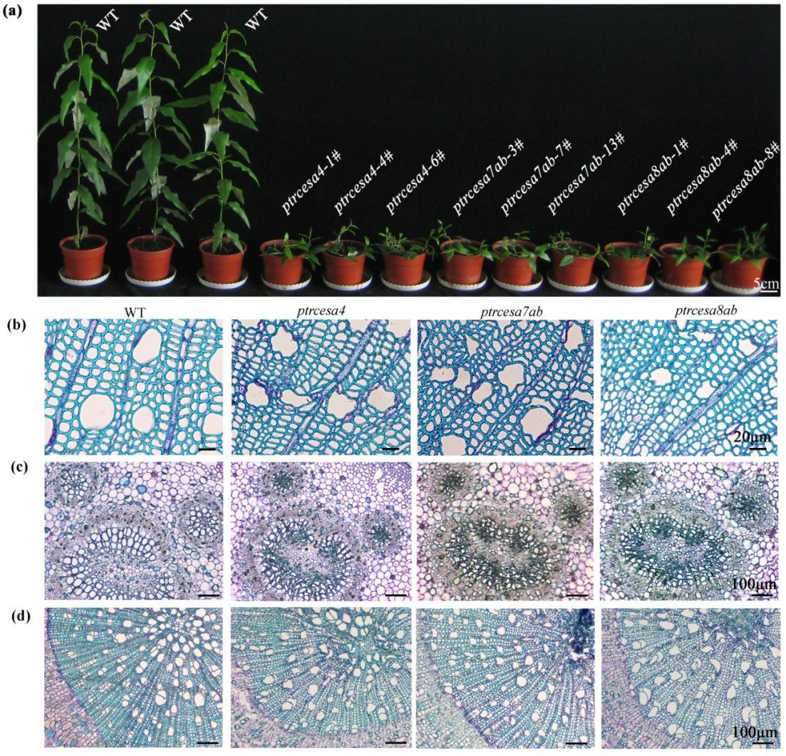 研究通过Cas9/gRNA基因编辑技术,创制了杨树5个SCW PtrCesAs基因的多个敲除突变体,遗传证据表明PtrCesA4、7A/B和8A/B功能相同且非冗余。生化证据表明PtrCesA4、7A/B和8A/B构成了次生木质部纤维素合酶复合体(CSC)核心成分。突变体木材纤维素含量从正常木材的42%减少至4%,表明杨树木材纤维素完全由PtrCesA4、7A/B和8A/B合成。进一步研究表明应拉木G层纤维素合成的CSC,也招募了PtrCesA4、7A/B和8A/B三类SCW PtrCesAs。结合免疫组化证据表明,PtrCesA4、7A/B和8A/B对于应拉木纤维G层形成和韧皮纤维细胞壁独特的结构是必不可少的。