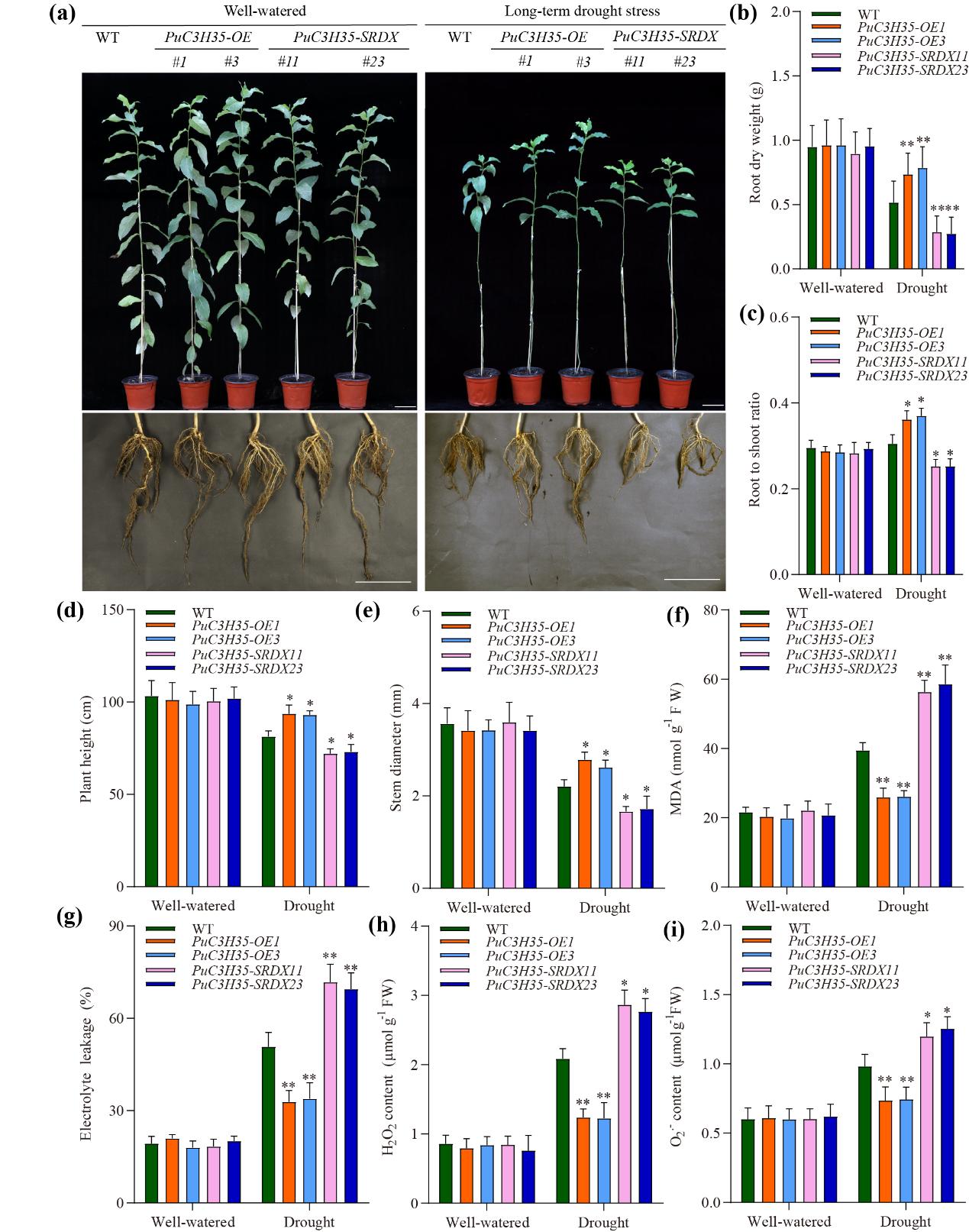 图1. PuC3H35过表达和抑制表达转基因大青杨的抗旱性分析