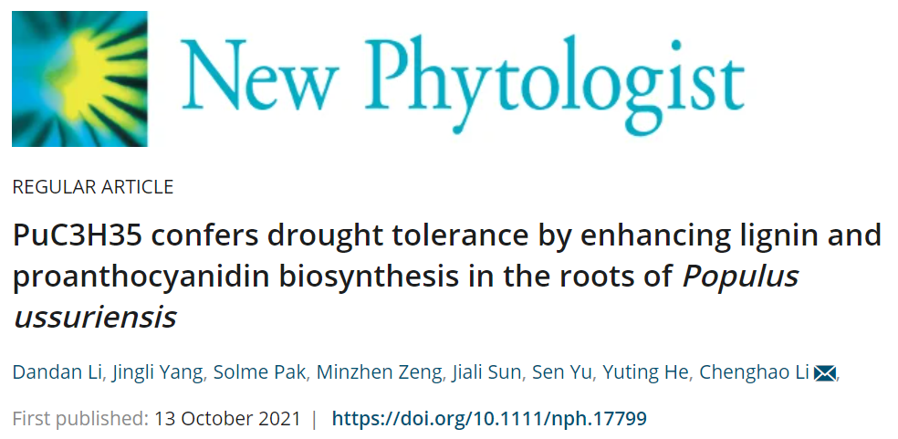 近日,林木遗传育种国家重点实验室(东北林业大学)李成浩研究组在国际植物学知名期刊New Phytologist(TOP期刊,IF=10.151)上在线发表了题为“PuC3H35 confers drought tolerance by enhancing lignin and proanthocyanidin biosynthesis in the roots of Populus ussuriensis”的研究论文。该研究揭示了CCCH型锌指蛋白转录因子PuC3H35在大青杨根部通过正调控原花青素(PA)生物合成基因和木质素生物合成相关基因表达增强大青杨干旱胁迫耐受性,为通过分子育种技术提高林木抗旱性提供了新的途径。