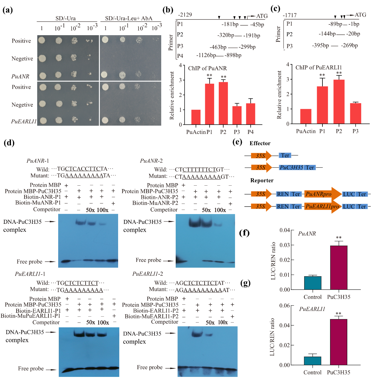 图2. PuC3H35的下游靶基因PuANR和PuEARLI1 的鉴定