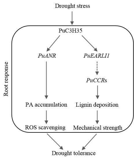 该研究结果揭示了一种新的植物抗旱性调控途径,即PuC3H35通过协同调控杨树根系中的“PuC3H35-PuANR-PA”和 “PuC3H35-PuEARLI1-PuCCRs-lignin”模块,介导了原花青素和木质素的生物合成,为大青杨根部应答干旱胁迫的分子机制提供了新的认识。