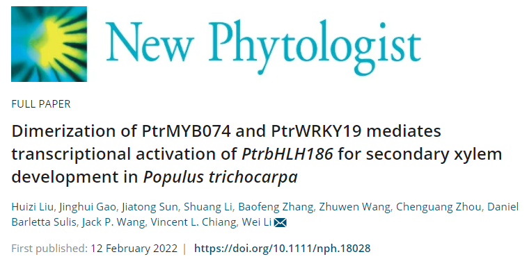 近日,林木遗传育种国家重点实验室(东北林业大学)李伟研究组在New Phytologist(TOP期刊,IF=10.151)上在线发表了题为Dimerization of PtrMYB074 and PtrWRKY19 Mediates Transcriptional Activation of PtrbHLH186 for Secondary Xylem Development in Populus trichocarpa的研究论文。该研究发现了调控杨树次生木质部发育的“PtrMYB074-PtrWRKY19-PtrbHLH186”分子模块,揭示了木材形成过程中转录因子(TF)-DNA和TF-TF相互作用的转录调控新机制,拓展了人们对木材形成的分子调控机制的科学认知,为利用分子育种技术进行林木材性遗传改良提供了新线索。