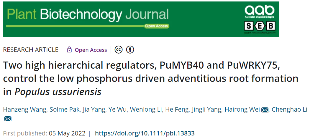 近日,我校林木遗传育种国家重点实验室李成浩研究团队在国际著名杂志Plant Biotechnology Journal(中科院一区,IF=9.803)上在线发表了题为“Two high hierarchical regulators, PuMYB40 and PuWRKY75, control the low phosphorus driven adventitious root formation in Populus ussuriensis”的研究论文。该研究发现了低磷信号快速诱导杨树不定根发生的新的调控机制和鉴定了2个关键调控因子PuMYB40和PuWRKY75。通过基因功能、调控网络和蛋白互作模式研究,探讨分析PuMYB40和PuWRKY75转录因子在短期低磷胁迫促进大青杨不定根发生过程中的功能,阐明由其介导的调控途径,为解析低磷信号调控杨树不定根发生和根系发育的分子调控机制这一重要科学问题的解决提供了线索与证据。