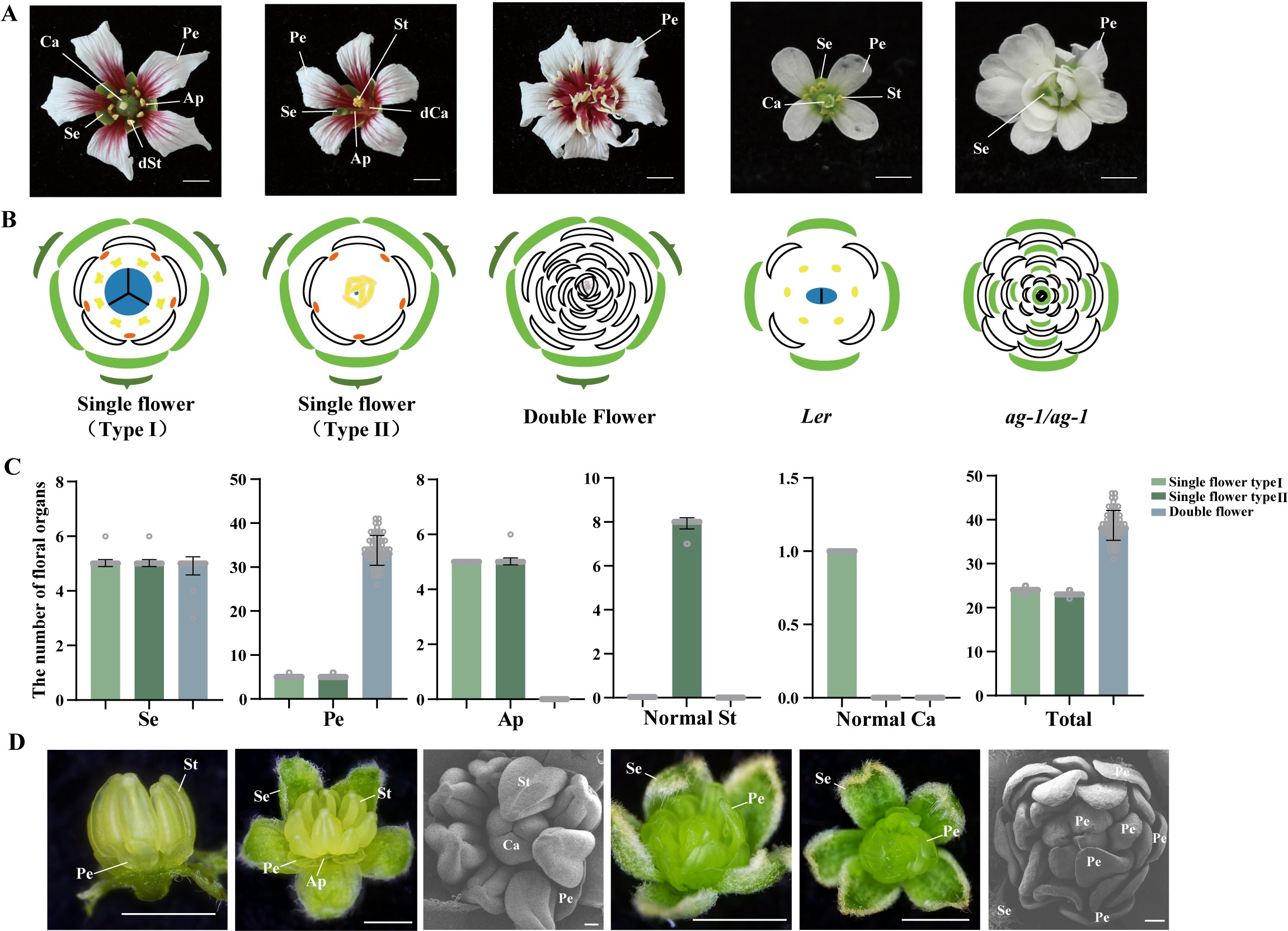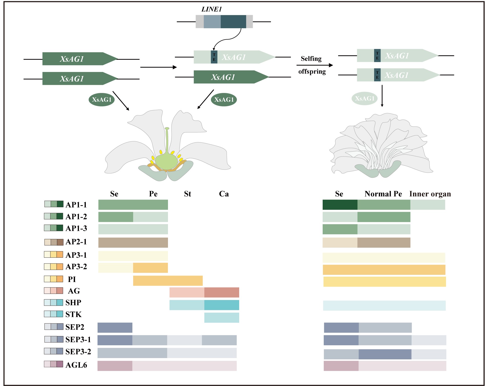 郑志民教授研究团队通过对文冠果重瓣花发育过程进行观察研究,确定了其单瓣花和重瓣花的结构变异起始于花器官原基发育时期,单瓣花具有完整的萼片、花瓣、雄蕊和雌蕊原基,而重瓣花只有萼片原基和多轮花瓣原基,并且在发育后期阶段还会出现新的花分生组织(图1)。同时,团队调查和收集了全国的文冠果资源,结合BSA混池测序和转录组测序多组学分析在文冠果重瓣花和单瓣花的自然群体中鉴定到1个基因XsAG1,其第二个内含子上的InDel位点与文冠果的重瓣花性状紧密连锁,并且发现在重瓣花群体中该InDel位点均存在,属于LINE1转座子的一部分。同时通过RT-PCR检测发现,在重瓣花该转座子片段插入纯合导致了XsAG1的功能性转录本急剧下降,出现了其他可变剪切方式,导致XsAG1丧失C类基因功能。原位杂交和拟南芥转基因的结果验证了文冠果的XsAG1控制雌蕊和雄蕊发育的功能保守。XsAG1突变后导致了花发育ABC模型其他基因的表达出现差异,使文冠果重瓣花呈现多轮花瓣形态(图2)。综上,该研究揭示了木本粮油经济林树种文冠果重瓣花的表型变异,为转座子插入导致植物表型重塑提供了证据,也为林木重要性状的鉴定提供了思路。