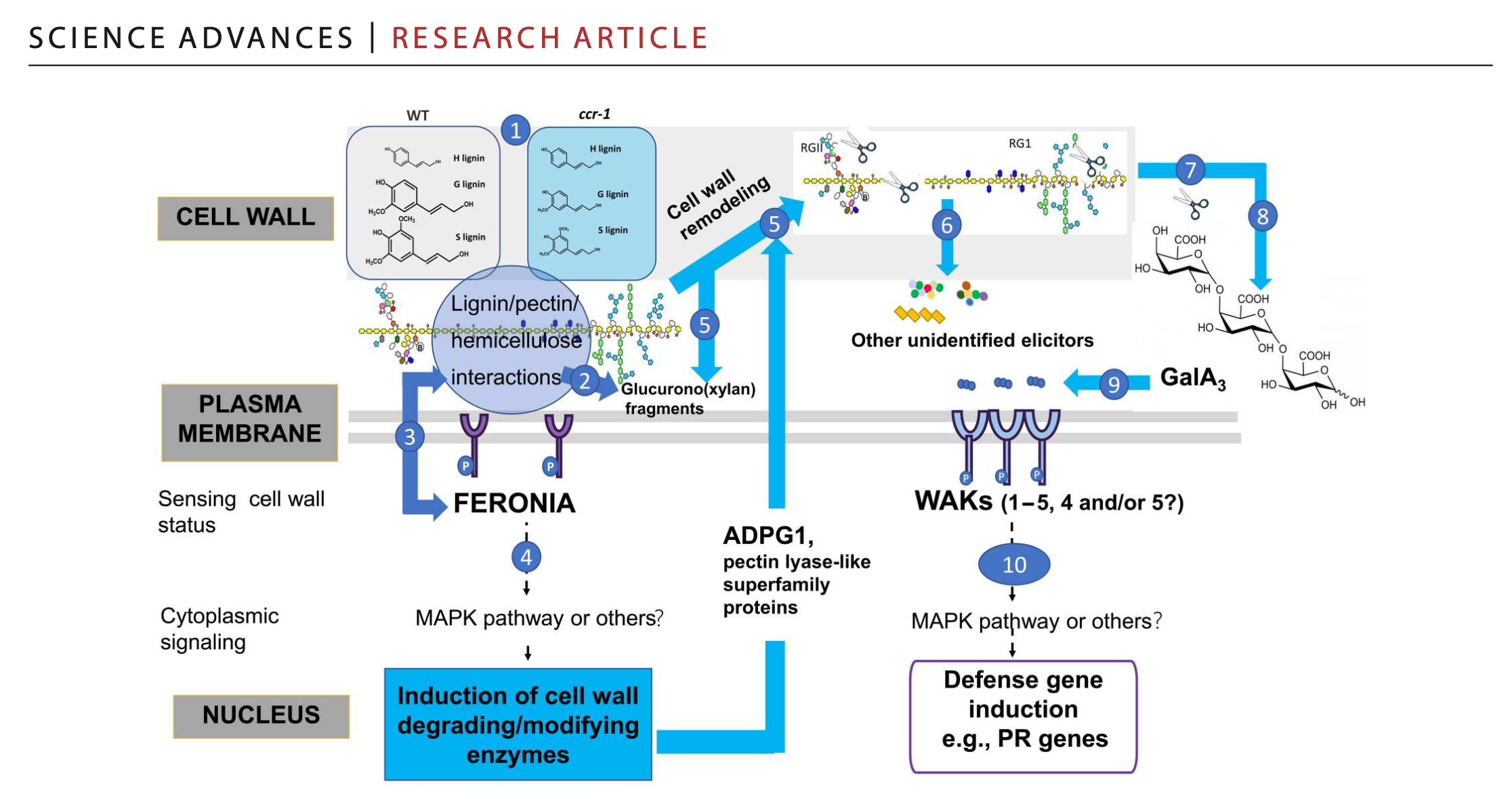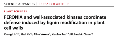 近日,林木遗传育种全国重点实验室(东北林业大学)刘畅教授团队与北德克萨斯大学Richard Dixon教授团队合作在Science杂志子刊 Science Advances (影响因子14.957)上在线发表了题为“FERONIA and wall-associated kinases coordinate defense induced by lignin modification in plant cell walls”的研究论文, 成功解析了木质素降低而产生的细胞壁信号感受转导机制,鉴定到两类传递细胞壁信号的重要受体,和一个可以激发抗病信号的细胞壁寡糖分子。