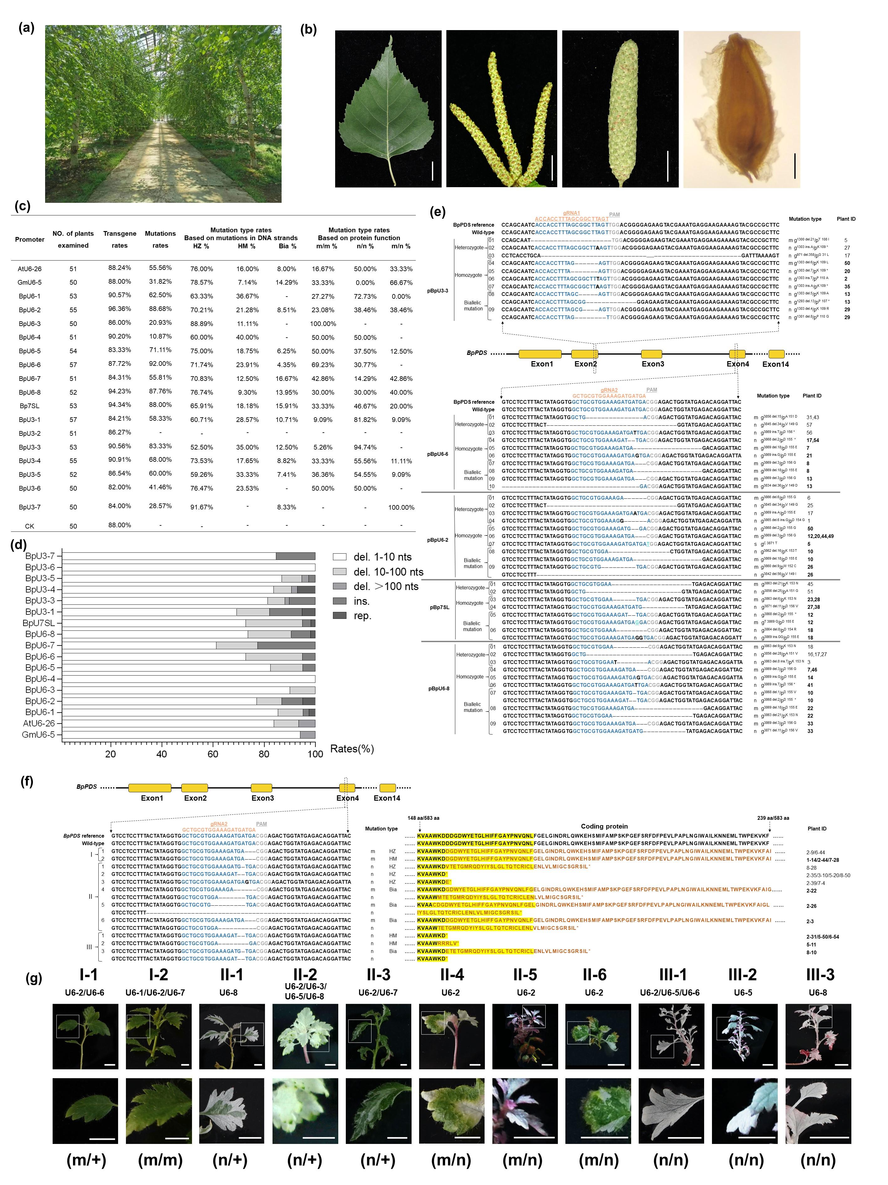 白桦(Betula platyphylla Suk.)分布面积广,在阔叶树种中森林蓄积量居于首位,在全球生态系统建立和国民经济建设中发挥着重要的作用。研究人员对“国家白桦良种基地”的白桦良种进行单株再生效率的筛选,以白桦腋芽为外植体进行离体培养,通过比较腋芽萌动、愈伤组织诱导率及不定芽分化率等指标,比较不同优树单株间无性繁殖效率的差异,最后筛选到一株优良单株(命名为DL-1)的愈伤分化率为100%,在25天生长期时即可形成不定芽,且不定芽茎粗,茎杆呈绿色,叶片大且厚。以DL-1优树为受体材料,进行白桦高效遗传转化/基因编辑体系的建立,以八氢番茄红素脱氢酶(PDS)基因为靶基因,以拟南芥ATU6-26启动子和大豆中GmU6-5启动子对照,对16个白桦内源Pol III启动子进行了筛选和鉴定。通过比较不同启动子驱动sgRNA的载体的转基因效率、基因编辑效率、双等位突变效率。最终,筛选到白桦内源的U6-2,U6-6和7SL等启动子具有较高的基因编辑效率和双等位突变效率。该研究为白桦及其他林木基因功能研究和分子育种奠定了基础。
