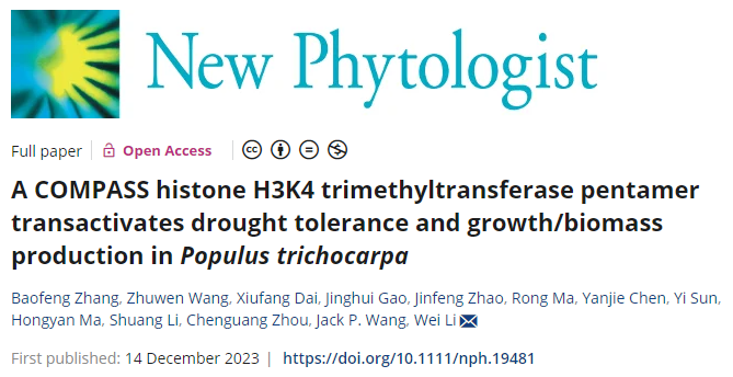 近日,林木遗传育种全国重点实验室李伟研究组在New Phytologist(TOP期刊,IF=10.5)上在线发表了题为A COMPASS histone H3K4 trimethyltransferase pentamer transactivates drought tolerance and growth/biomass production in Populus trichocarpa的研究论文。该研究明确了H3K4三甲基转移酶-COMPASS复合体如何精准定位到干旱应答基因,并激活其表达,从而提高杨树的耐旱性并优化其生长状态。