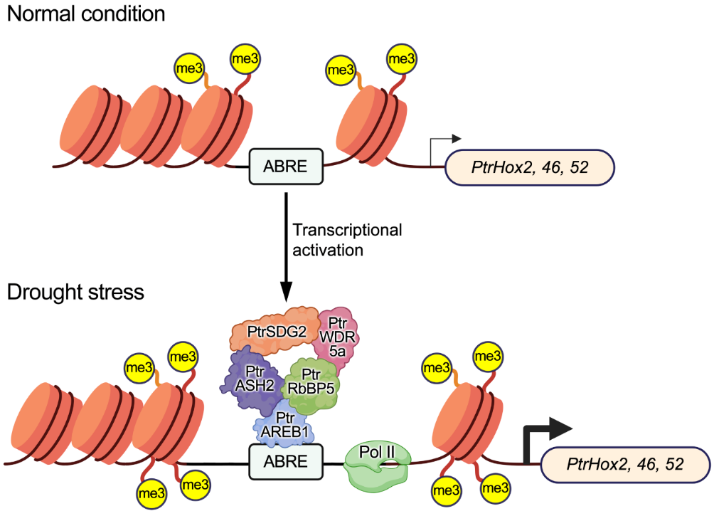 水资源是影响森林生产力的主要环境因素之一。因此,增强树木的抗旱能力,对强化森林生态系统的适应性至关重要。表观遗传修饰在帮助植物抵御和适应环境变化中发挥着重要作用,尤其是组蛋白H3第4位赖氨酸的三甲基化(H3K4me3)修饰,已被证实可以激活干旱应答基因的转录,以应对干旱环境。然而,其具体的调控机制还尚不清楚。