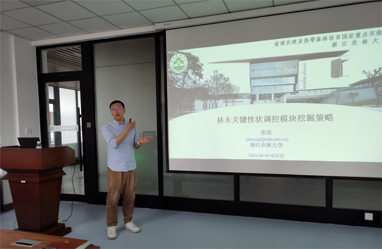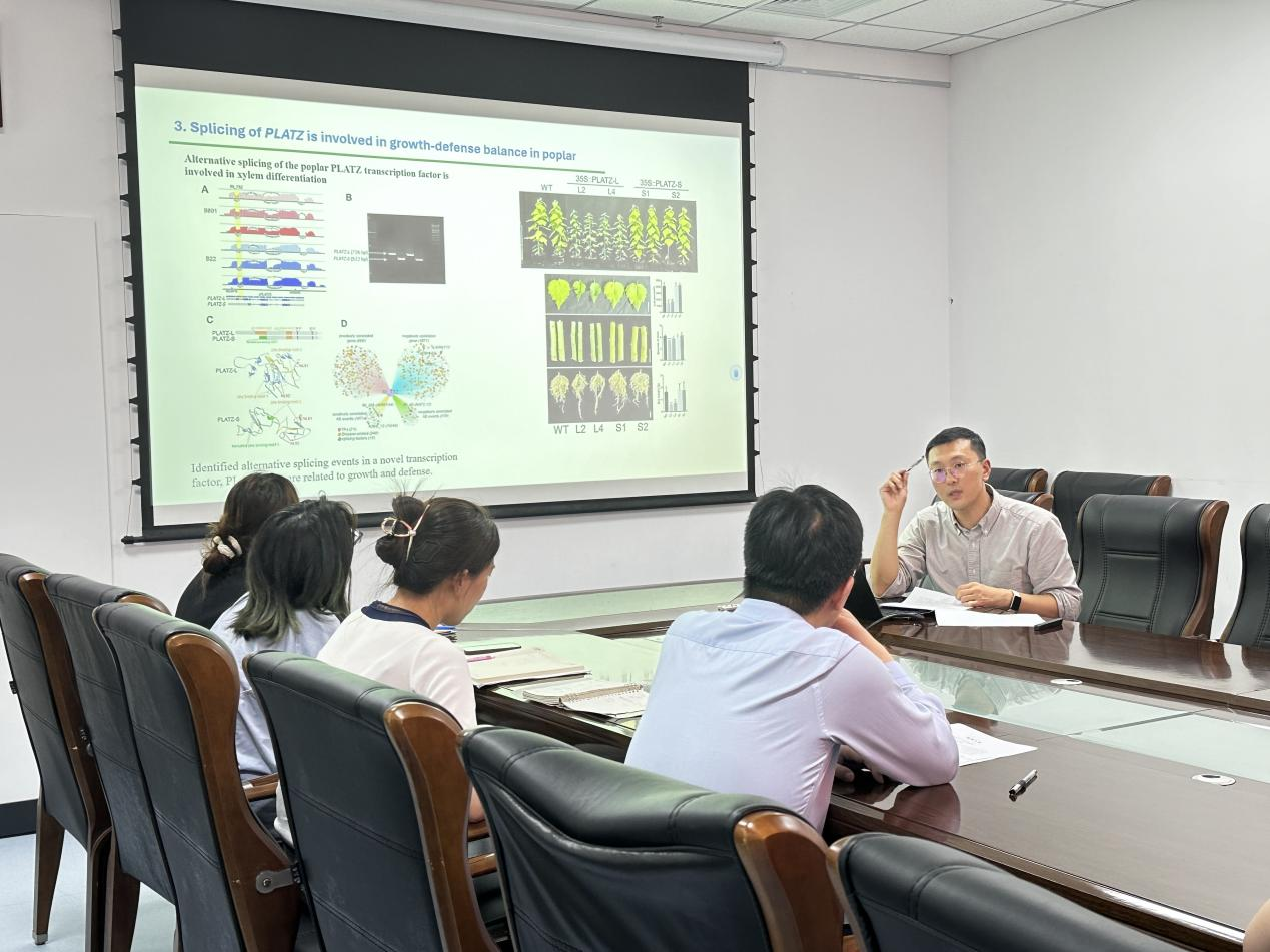 会上,张进教授首先为项目组师生作了题为“林木关键性状调控模块挖掘策略”的学术报告。报告主要介绍了利用杨树群体的GWAS和eQTL分析,获得林木关键性状调控的候选基因及其调控模块,同时结合多组学数据及基因表达系统,能有效提高基因调控模块的鉴定效率,为分子模块设计育种奠定基础。
