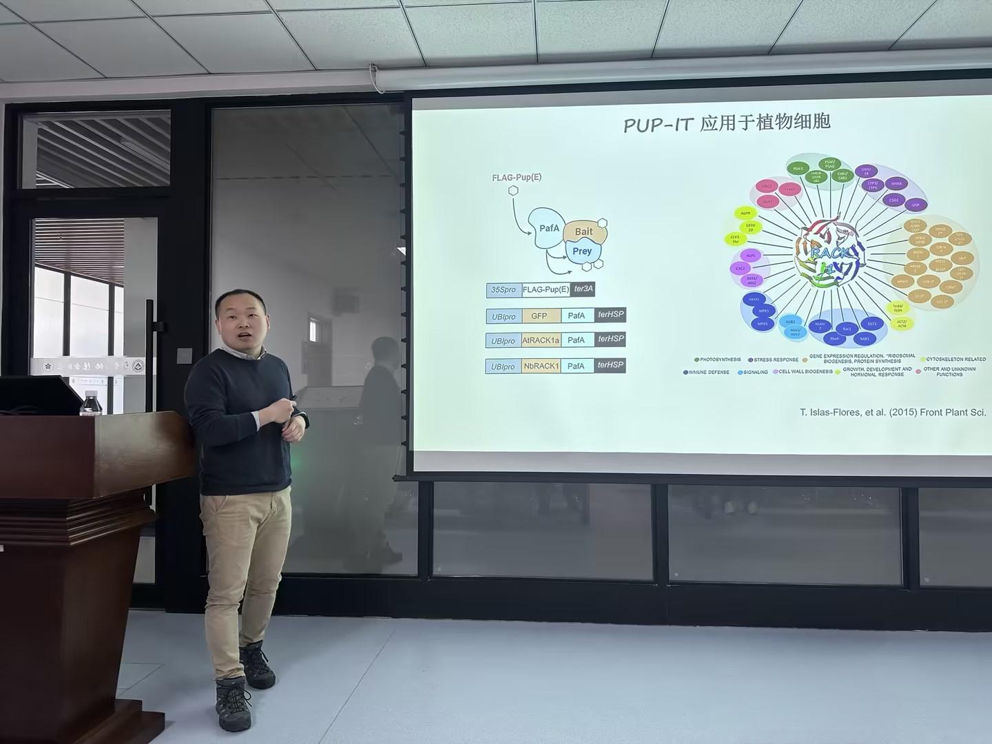 郑帅老师长期从事植物细胞壁合成与维管组织发育调控研究,近年来在Nature Communications、Advanced Science、Plant Communications等国际主流期刊发表多篇高水平论文。此次报告中,他重点介绍了团队最新研究成果:在植物中建立并优化了PUP-IT(Pupylation-based Proximity Labeling)蛋白邻近标记系统,以更高的特异性和空间分辨率捕捉蛋白质间的相互作用。报告期间,郑帅老师通过实际案例,展示了该技术在识别纤维素合成复合物(CSC)调控因子中的应用,特别是发现了ADP-核糖基化因子鸟苷酸交换因子(ARF-GEF)BEN1在CSC内吞和循环过程中的关键作用,揭示其在植物细胞壁合成中的调控机制。这一成果究不仅拓展了人们对细胞壁动态调控的理解,也为精准改良植物生物质性状提供了技术支撑。报告内容丰富、逻辑清晰,深入浅出地介绍了前沿技术,并结合实际案例阐述了其在基础研究与应用领域的广阔前景,吸引了众多师生前来聆听。在交流互动环节,郑帅老师就实验操作、数据解读、技术适配等问题,与师生们展开深入讨论,耐心解答疑问,为大家提供了宝贵的指导与建议。